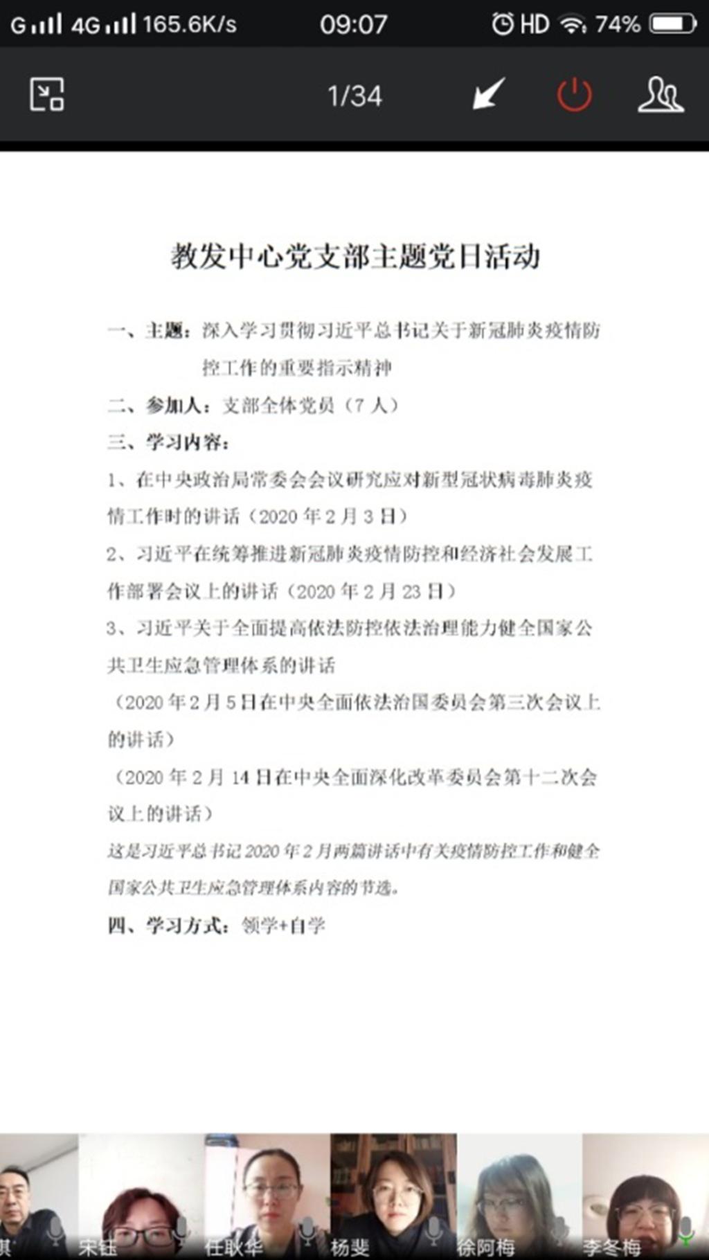 此次主题党日活动依托企业微信视频会议开展,由支部书记李冬梅带领全体党员深入学习习近平总书记关于疫情防控工作的重要讲话重要指示精神,副校长吕晓琪以普通党员身份参加本次党日活动。
