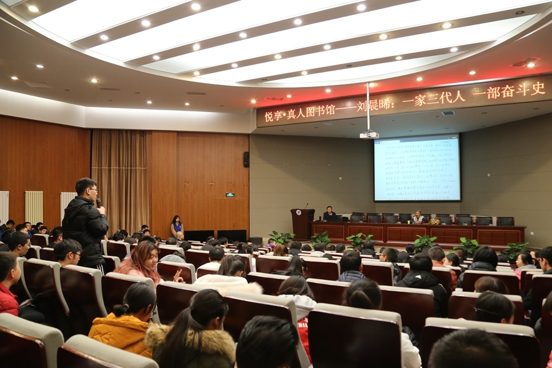 11月22日晚,图书馆党总支与校工会联合开展“不忘初心、牢记使命”主题党日活动,邀请我校退休老教授刘晨晞现身说法,倾情讲述家族百年奋斗史。活动由图书馆党总支副书记、馆长周文学主持,校工会主席、各学院分工会主席、师生代表等260余人参加。这是图书馆“不忘初心、牢记使命”主题教育活动之一,也是图书馆开展的第14期“真人图书馆”活动。