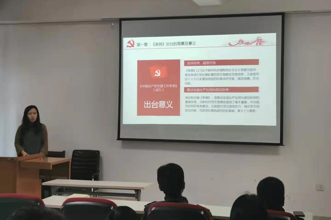 团学办公室辅导员、党务秘书菅妮以“贯彻支部工作条例,提升支部建设水平”为题,领学了《中国共产党支部工作条例》相关内容,使各支部委员明晰了党支部工作在基层党建中关键重要性,强调各支部应加强组织生活,活跃组织氛围,注重树立模范典型带动支部发展。
