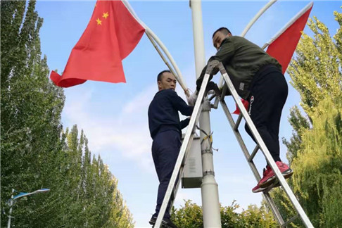 活动中,党员们和后勤绿化、水电服务中心的技工师傅们一同在两校区主干道悬挂了170面鲜红的五星红旗。在悬挂国旗的过程中,党员们不仅提高了爱国意识,还增强了民族自豪感和国家认同感。飘扬着的五星红旗为校园营造出热烈、喜庆的节日氛围,表达了工大人对伟大祖国的良好祝愿。