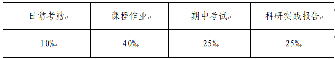 课程考核形式为考勤、作业、期中考试,以及围绕科研实践结课报告产出的评分。其中的助教课自愿参加,不计入考核范围,课程考核各部分占比如下: