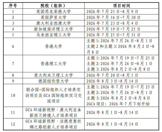 2026年暑期短期交流项目涵盖国际组织实习、学术研修、名校参访、文化体验等不同类别,共12个项目,具体如下: