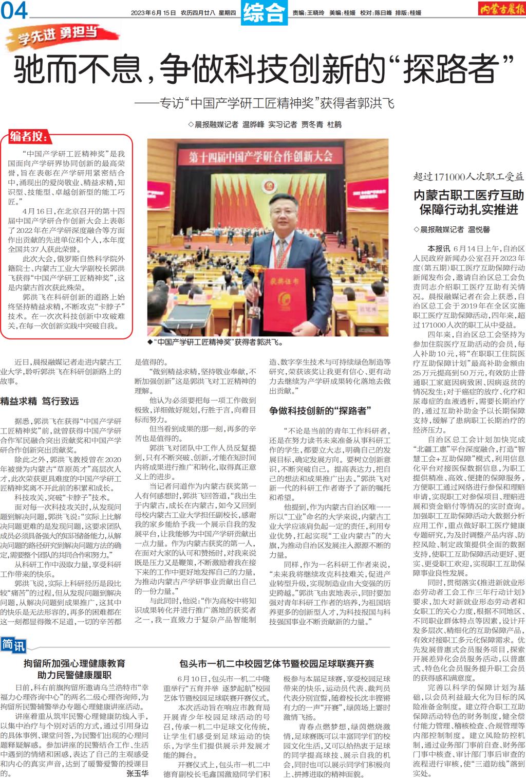 【内蒙古晨报】内蒙古首次!郭洪飞获中国产学研工匠精神奖
