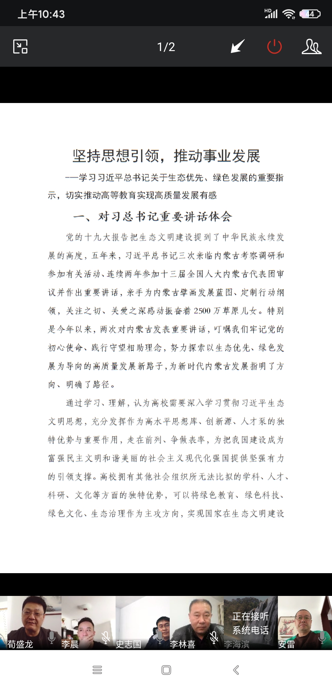 会上,5位处级领导干部结合个人学习体会和具体工作,围绕习近平总书记“关于生态优先、绿色发展的重要指示,切实推动高等教育高质量发展”等内容分别作研讨发言。