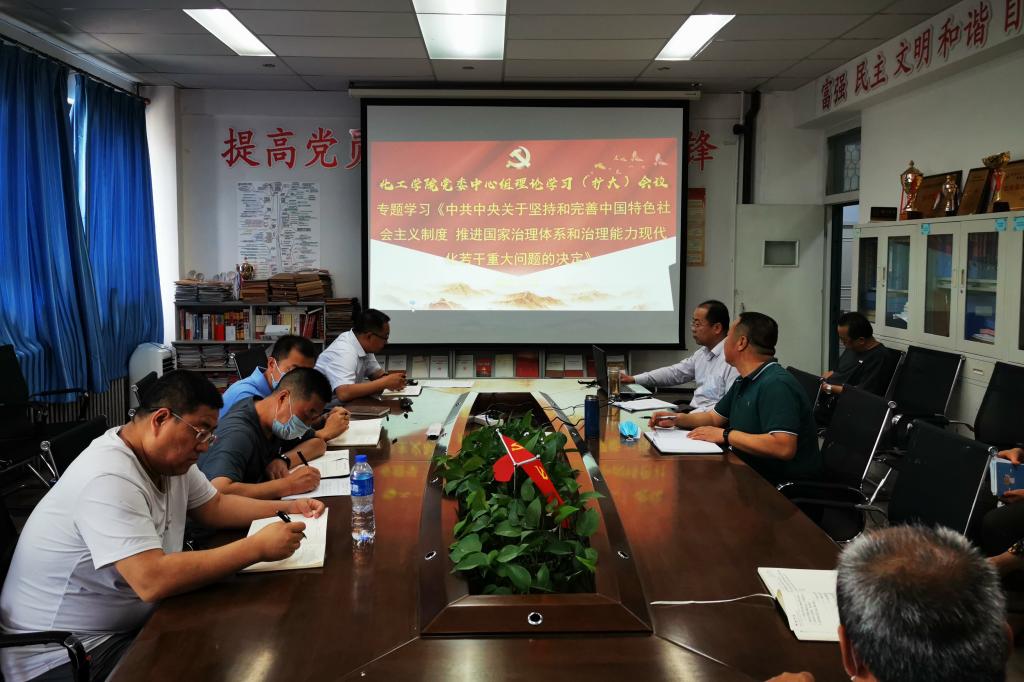 6月18日下午,化工学院党委召开理论学习中心组(扩大)学习会暨第二次深入学习贯彻党的十九届四中全会精神专题培训,学院全体党委委员、党支部书记、科级干部参加。会议由党委书记王凯主持。