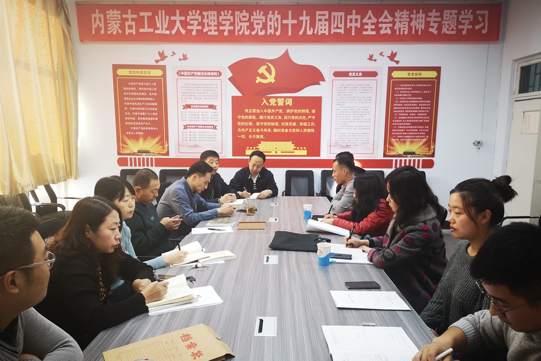 党的十九届四中全会于2019年10月28日至31日在北京举行,会议公布了《中国共产党第十九届中央委员会第四次全体会议公报》。11月11日,理学院组织召开党委中心组学习会对《公报》进行了深入学习,并对全院进行了学习部署。11日至15日期间,全院掀起了学习贯彻十九届四中全会精神的热潮。