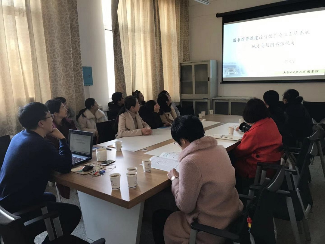 周文学介绍了我校图书馆的概况,从人力资源、文献资源、空间资源三个方面对图书馆资源建设进行了详细阐述,从读者服务、学科服务、日常服务、专业水平提升等方面对馆员专业素质养成进行了深入解读,并就当前高校图书馆建设与发展的趋势进行了探讨和交流。座谈会后,周文学及支部书记带领来宾分别参观了金川校区逸夫图书馆、新城校区图书馆和建筑学科馆,在现场着重介绍了本馆改造或调整的空间、学术研讨间、校园书店、学科馆沙龙等特色空间建设。