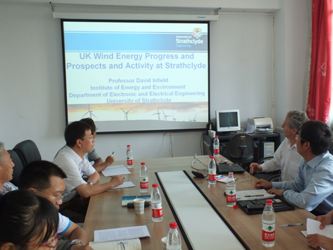David Infield 教授作了题为《UK Wind Energy Progress and Prospects and Activity at Strathclyde》的报告,主要介绍了英国2020年可再生能源发电规划、英国风力发电现状、风电技术所面临的一些挑战以及斯莱斯克莱德大学风能系统博士培训中心(Doctoral Training Centre)的概况等。双方还就感兴趣的一些科研及人才培养问题进行了热烈的讨论。