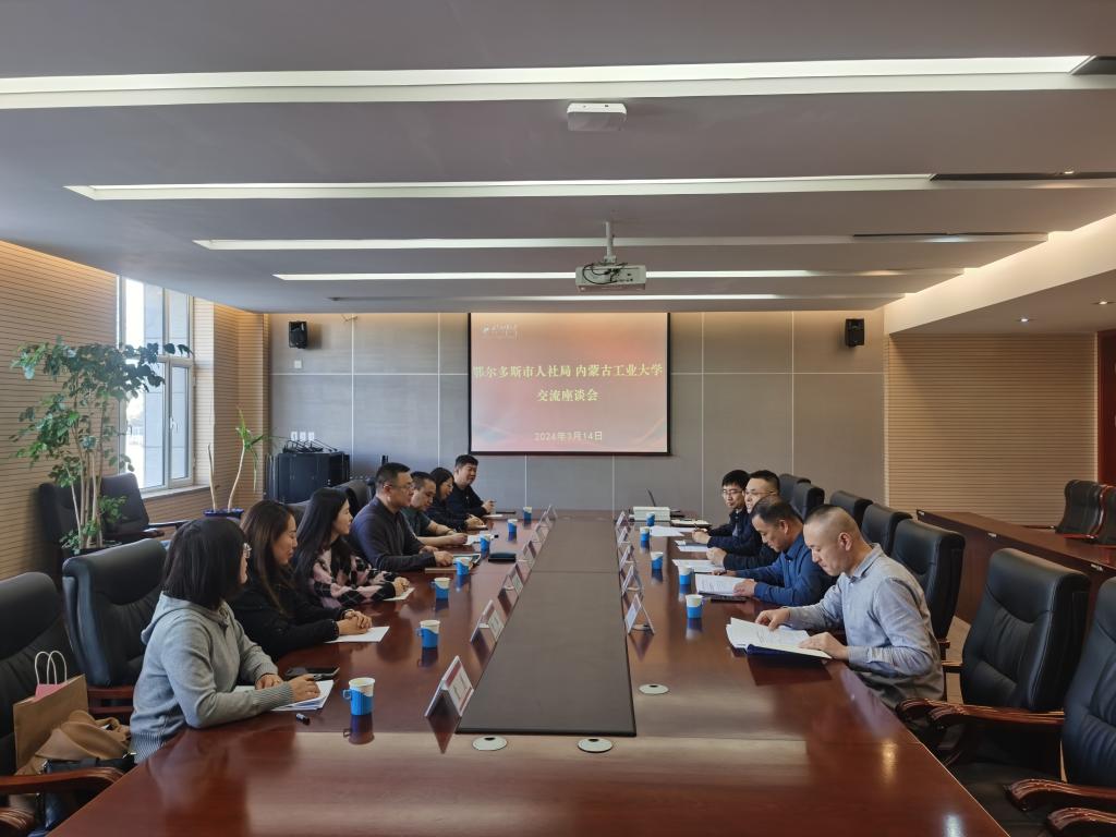 3月14日下午,鄂尔多斯市人力资源和社会保障局党组成员、副局长布仁德力根一行7人来我校调研并座谈。党委教师工作部(人事处)、产业技术转移与成果转化中心等相关职能部门负责人参加座谈。