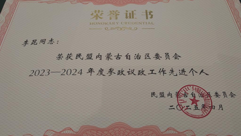 近日,民盟内蒙古自治区委员会召开2025年参政议政工作会议。会议总结民盟内蒙古区委会2024年参政议政工作、部署2025年参政议政工作,表彰20232024年度参政议政工作先进集体和个人。民盟内蒙古工业大学总支荣获“20232024年度民盟内蒙古自治区委员会参政议政工作优秀集体”称号,总支组织委员李昆荣获“民盟内蒙古自治区委员会20232024年度参政议政工作先进个人”荣誉称号。