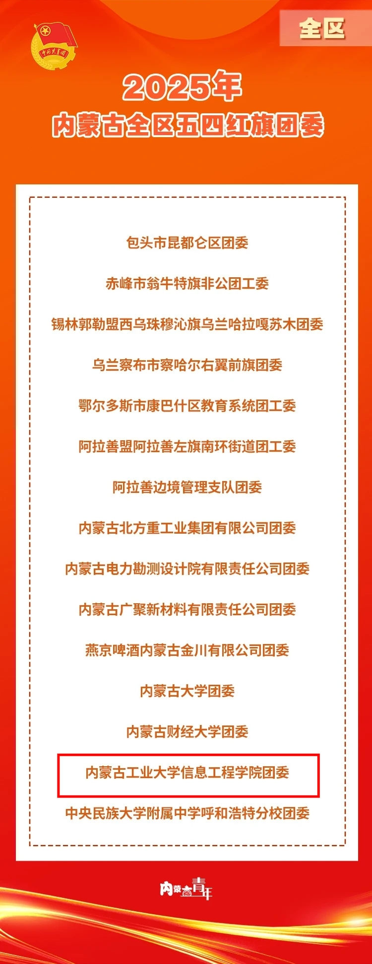 近日,内蒙古自治区团委发布2025年度全区“两红两优”名单,决定授予44名同志“全区优秀共青团员”荣誉称号,授予36名同志“全区优秀共青团干部”荣誉称号,授予 15个团委“全区五四红旗团委”荣誉称号,授予25个团支部“全区五四红旗团支部”荣誉称号,我校信息工程学院团委光荣上榜