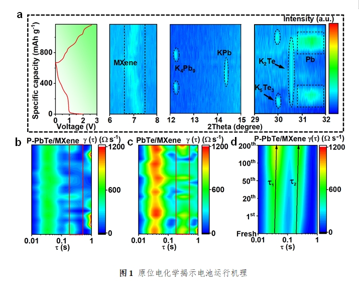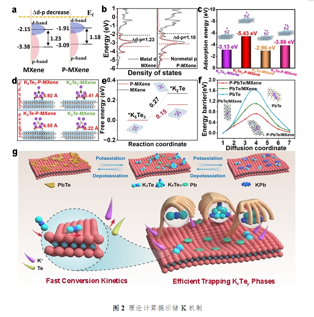 近日,我校新能源学院张业龙教授团队在钾离子电池领域取得重要进全球化背景下,气候变化问题引起国际社会广泛关注碳中和成为全球行动的共识目标,开发新型廉价储能装置尤为迫切钾离子电池(KIBs)因K资源丰富和较低的氧化还原电位而成为研究热点。我校新能源学院张业龙教授团队基于前期KIBs工作(Adv. Mater. 2024, 36, 2407134;Adv. Mater. 2021, 33, 2100272),构建超结构P-PbTe/MXene。该负极具有多重优势主要体现在,P-PbTe/MXene具有丰富Te空位和层级结构可提供多维离子扩散通道和充足的活性位点,提升储K动力学同时P-MXene基底对Te化物中间体表现出强吸附和催化能力,可抑制穿梭效应加速转化反应。结果表明,P-PbTe/MXene负极在2 A g−1循环2000可逆容量为180.1 mAh g−1理论计算揭示了其强吸附催化能力和低离子扩散能垒遵循可逆的嵌入-转化-合金化反应路径。该研究为PbTe材料在KIBs领域的进一步开发奠定了基础。