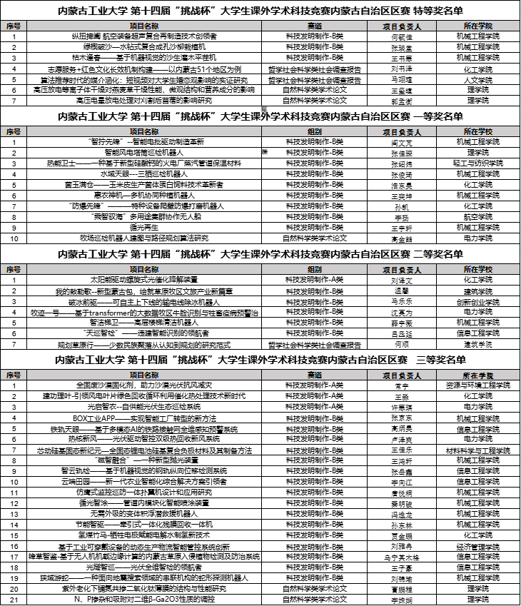 近日,内蒙古自治区第十四届“挑战杯”大学生课外学术科技作品竞赛在内蒙古大学落下帷幕。经过激烈比拼,我校团队荣获特等奖7项、一等奖10项、二等奖7项佳绩,以本科高校组团体总分第1名的总成绩再次捧起省赛最高荣誉“挑战杯”,充分展现了我校学子的科技创新和实践能力。