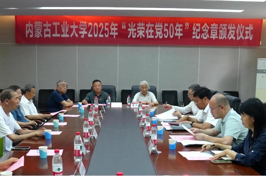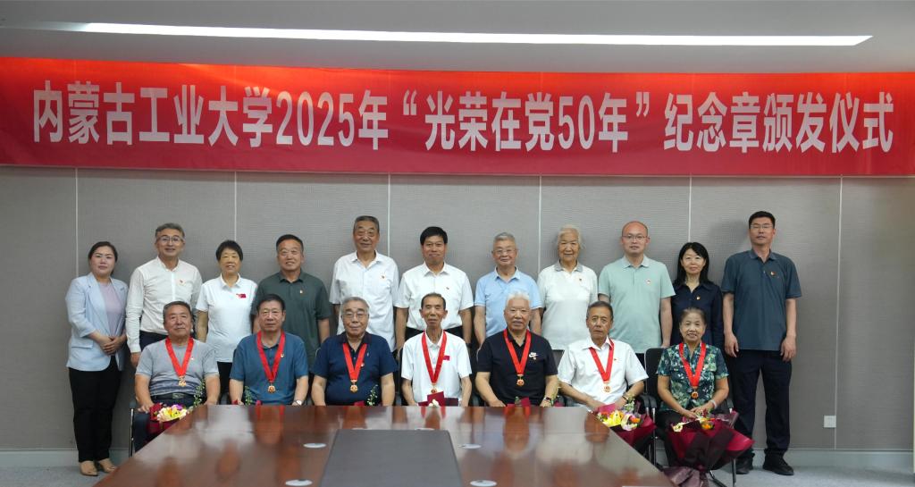 会议宣读2025年内蒙古工业大学“光荣在党50年”党员名单。赵增武为到会老党员代表颁发“光荣在党50年”纪念章并向他们致以热烈的祝贺与崇高的敬意。高度赞扬老党员为学校发展做出的贡献,希望老党员们继续发挥政治优势,做理想信念的“播种机”用亲身经历讲好“入党为什么、在党干什么、为党留什么”的生动党课发挥经验优势,做学校发展的“智囊团”学校“十五五”规划编制、校志编撰、工大精神凝练等工作中贡献智慧力量发挥“五老”讲师团作用,做青年成长的“引路人”通过“银青结对”工程帮助年轻教师快速成长为大学生思想政治教育注入银发力量
