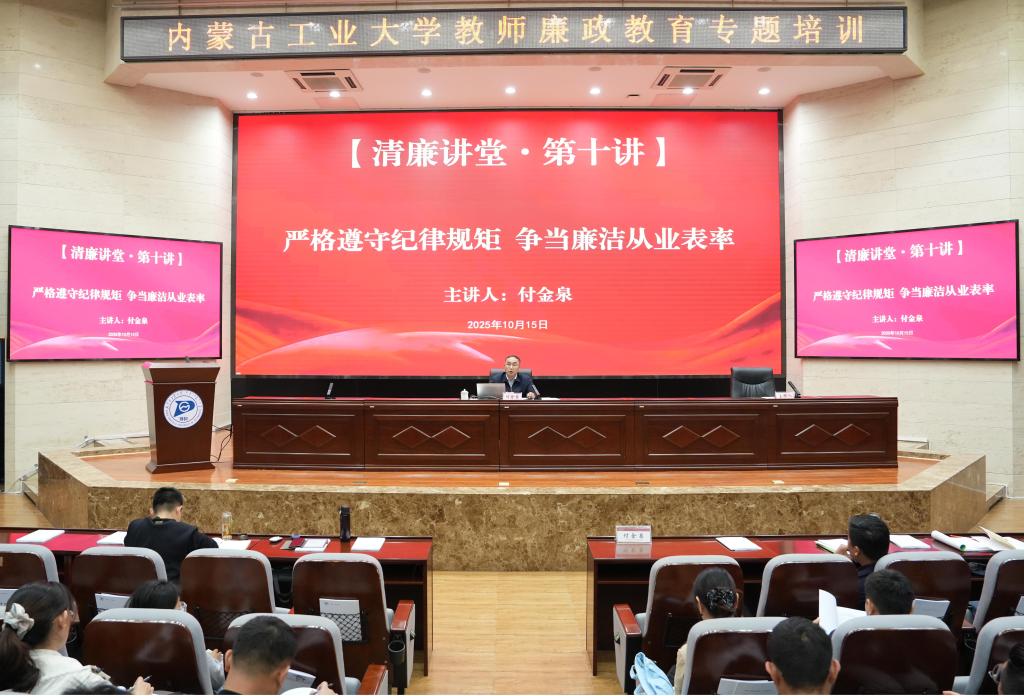 10月15日我校在明德楼第一报告厅举行新入职教师廉政教育专题培训校党委委员、纪委书记付金泉作专题讲座。2025年新教师教学能力培训班全体教师部分年轻科级干部参加。教师发展中心主任徐鹏主持讲座