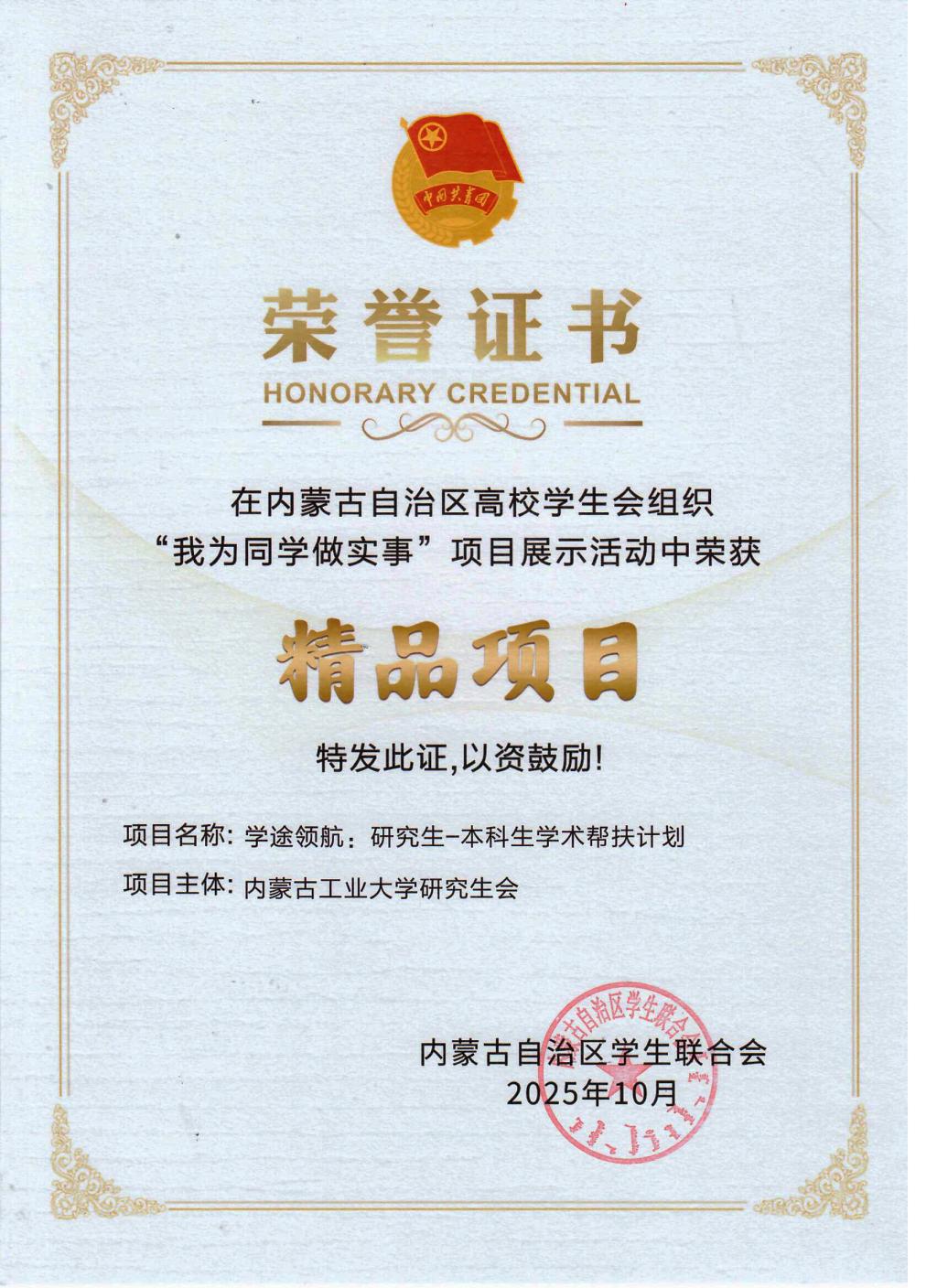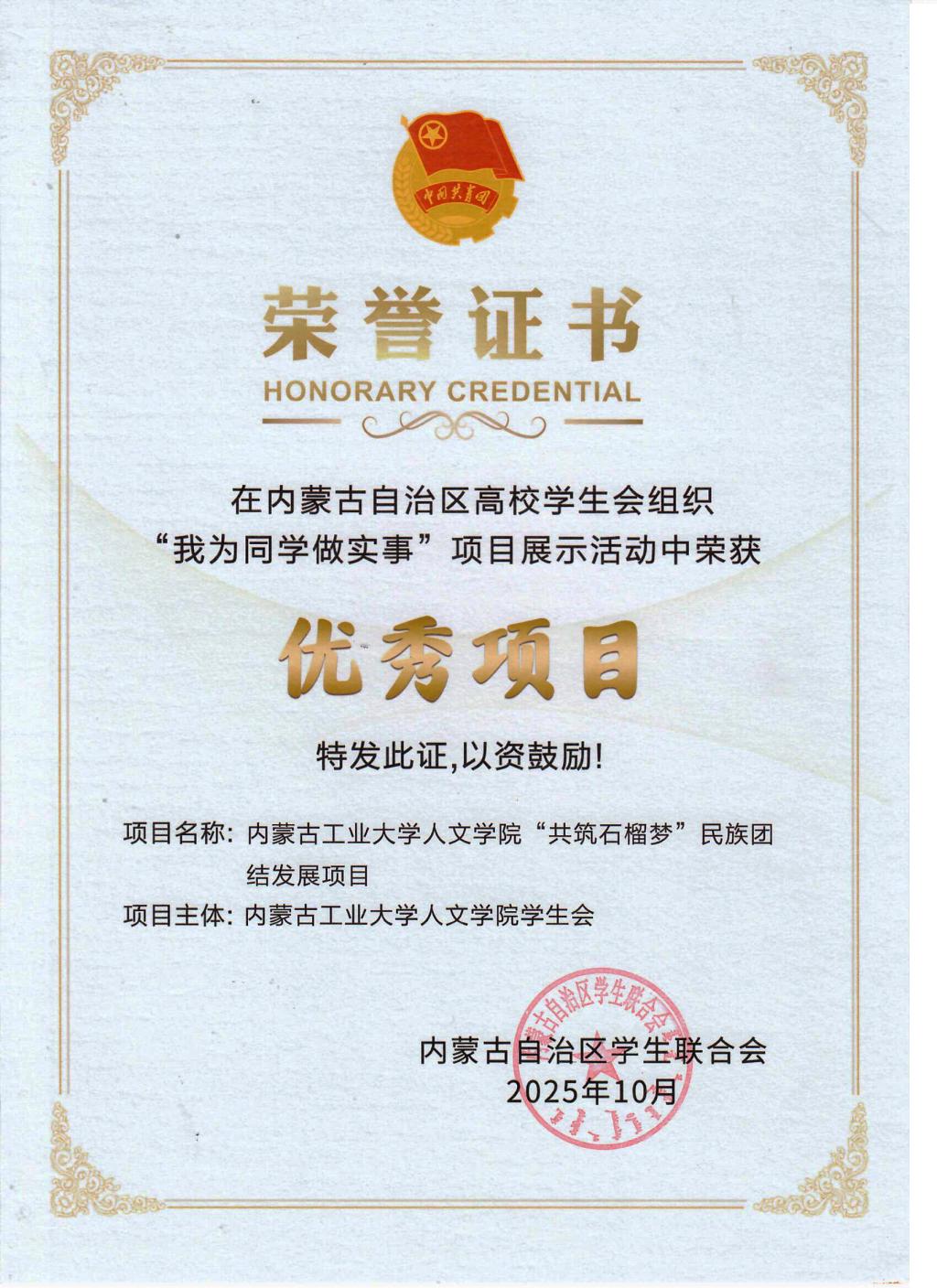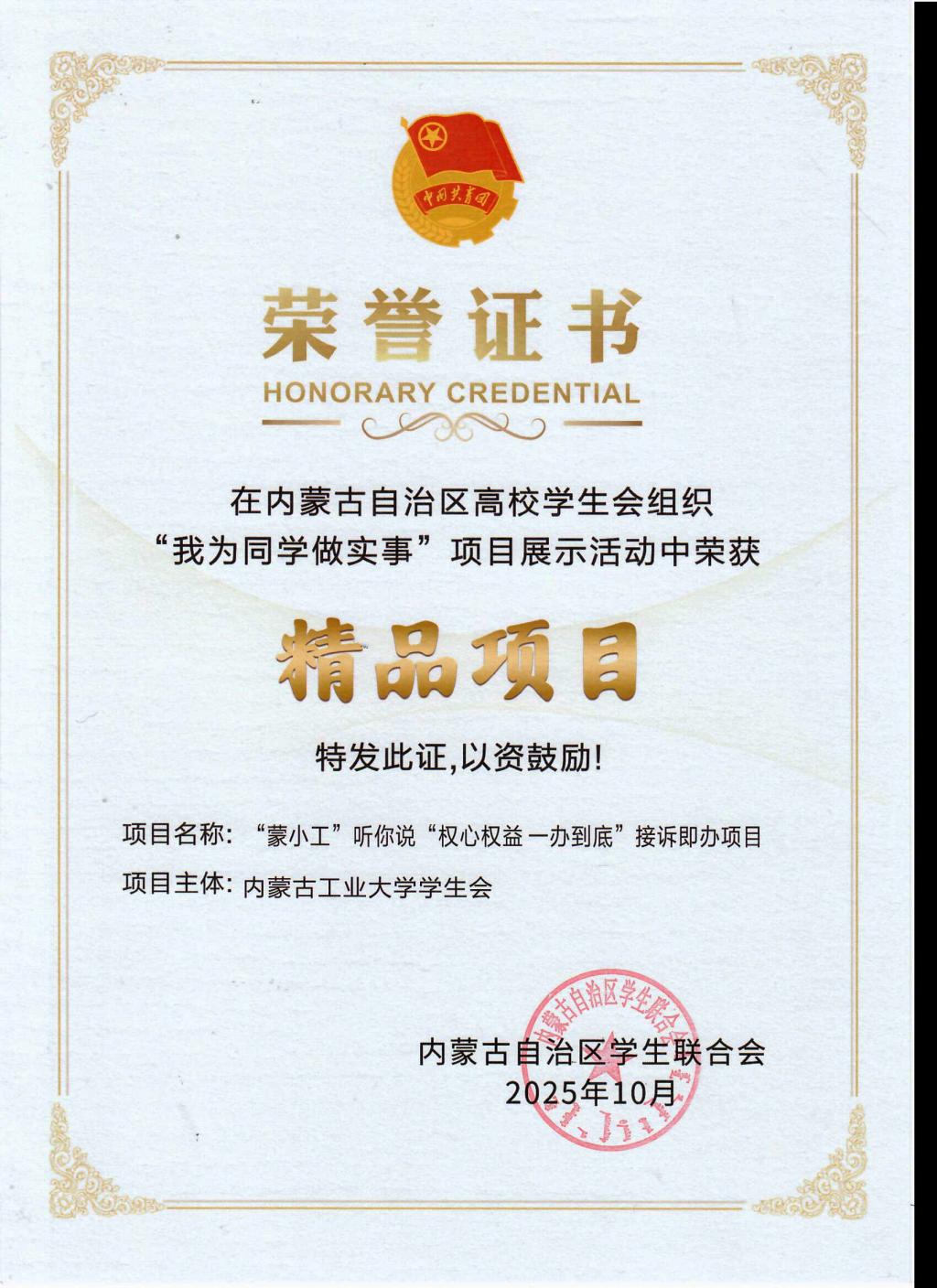 10月19日至20日,由共青团内蒙古自治区委员会指导、内蒙古自治区学生联合会主办的2025年“我为同学做实事”项目展示活动赛在内蒙古建筑职业技术大学圆满落幕全区37所高校50个项目入围展示。我校推选的三个项目中,《“蒙小工”听你说“权心权益一办到底”接诉即办项目》《学途领航:研究生-本科生学术帮扶计划》获“精品项目”、《内蒙古工业大学人文学院“共筑石榴梦”民族团结发展项目》“优秀项目”,充分展现我校学生会组织服务青年学生的扎实成效与创新活力。