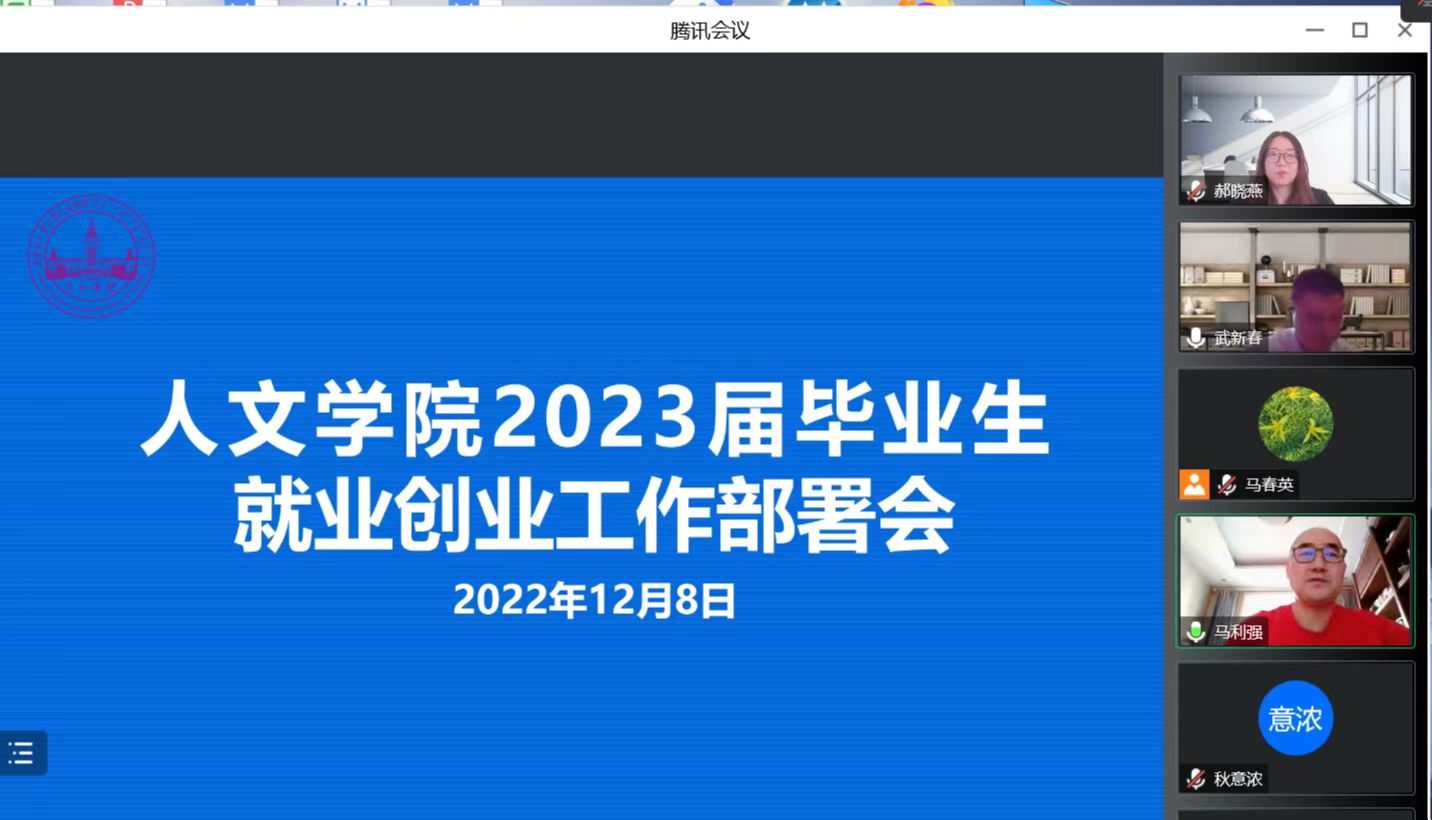 12月8日下午,人文学院线上召开2023届毕业生就业创业工作部署会学院领导班子成员、全体教师参加会议。学院党委副书记、副院长武新春主持会议。