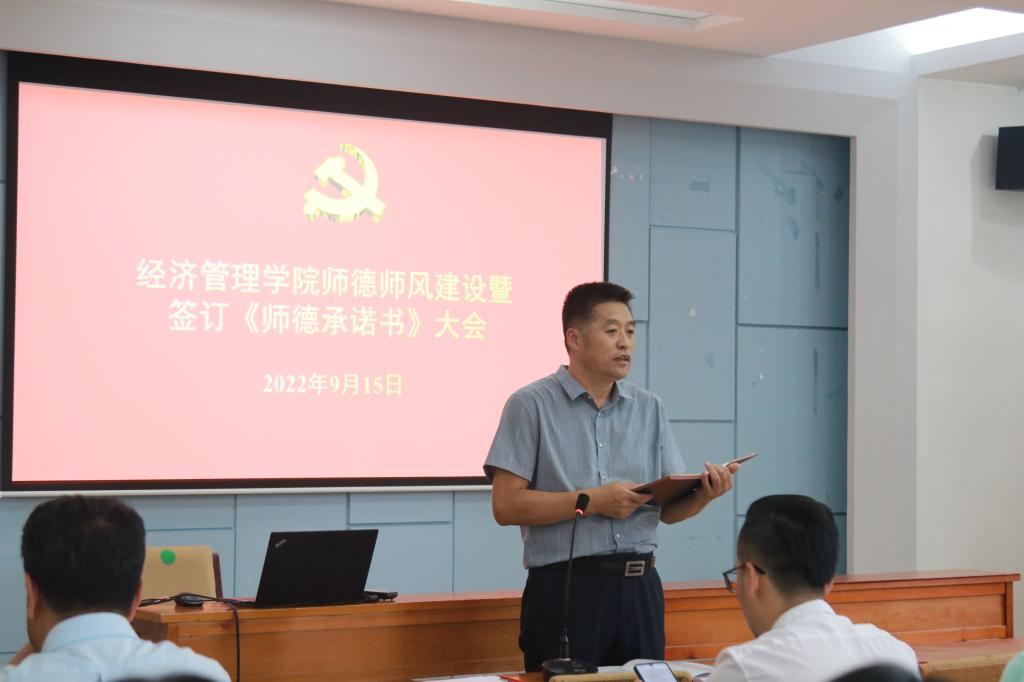 为进一步加强学院师德师风建设,规范教师执教行为,提高教师的职业道德水平,根据学校要求,9月15日下午,经济管理学院召开师德师风承诺书签订大会。会议由学院党委书记祁龙主持,全体教师参加。