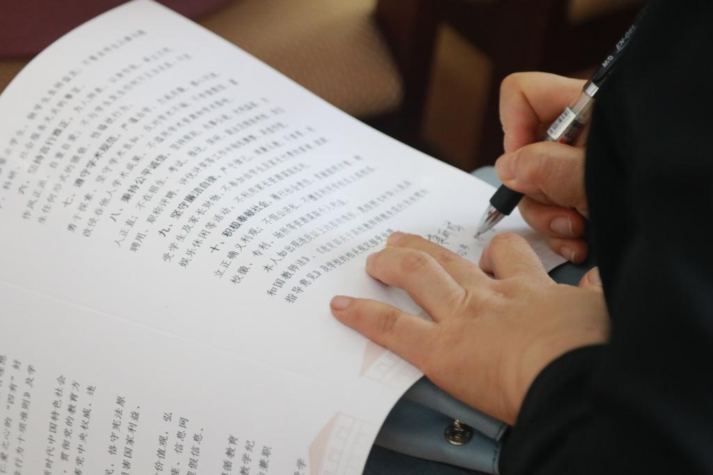 最后,全体教师郑重地在承诺书上签名,表示要坚决贯彻落实《新时代高校教师职业行为十项准则》及学校各项规章制度,以严格规范的师德风范投入教育教学工作中,认真履行教书育人职责,为教育事业作贡献。