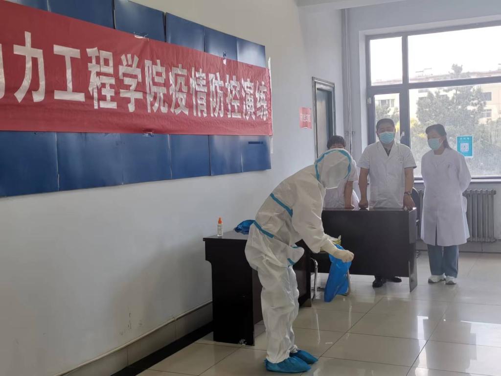 本次演练严格按照学校疫情防控工作的有关要求,结合学院特点有针对性地开展疫情防控应急演练。演练开始前,校医院董卫红、高正强、贾爱萍三位工作人员为现场人员演示了防护服的正确穿脱方式,随后依次进行学院七个场景的演练,分别是学生在返校途中、学生返校入校时、学生在宿舍晨午检、学生在行政区域办理相关业务、教师在教室上课、研究生工作室、实验室出现异常情况的应急处置。