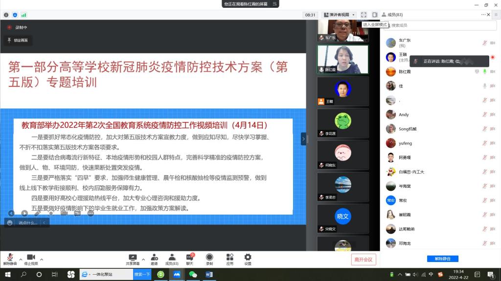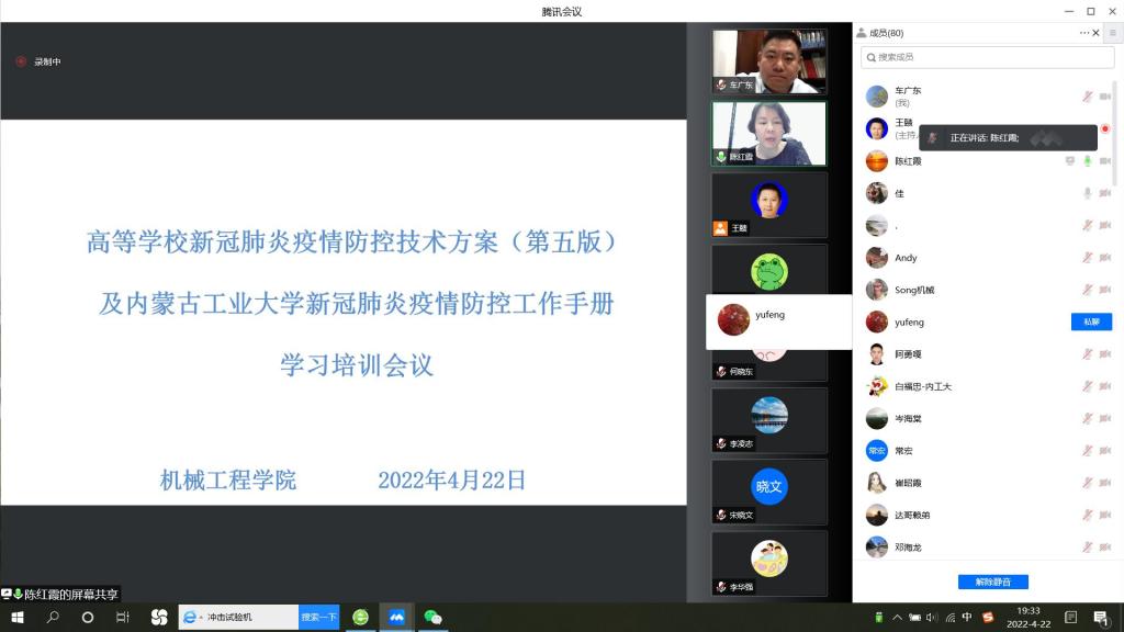 为扎实做好疫情防控工作,提高教师疫情防控意识和处置突发事件能力,4月22日晚,机械工程学院组织开展教师疫情防控专题培训会。学院党委书记车广东主持会议。会议以线上方式进行,全院教职工参加。