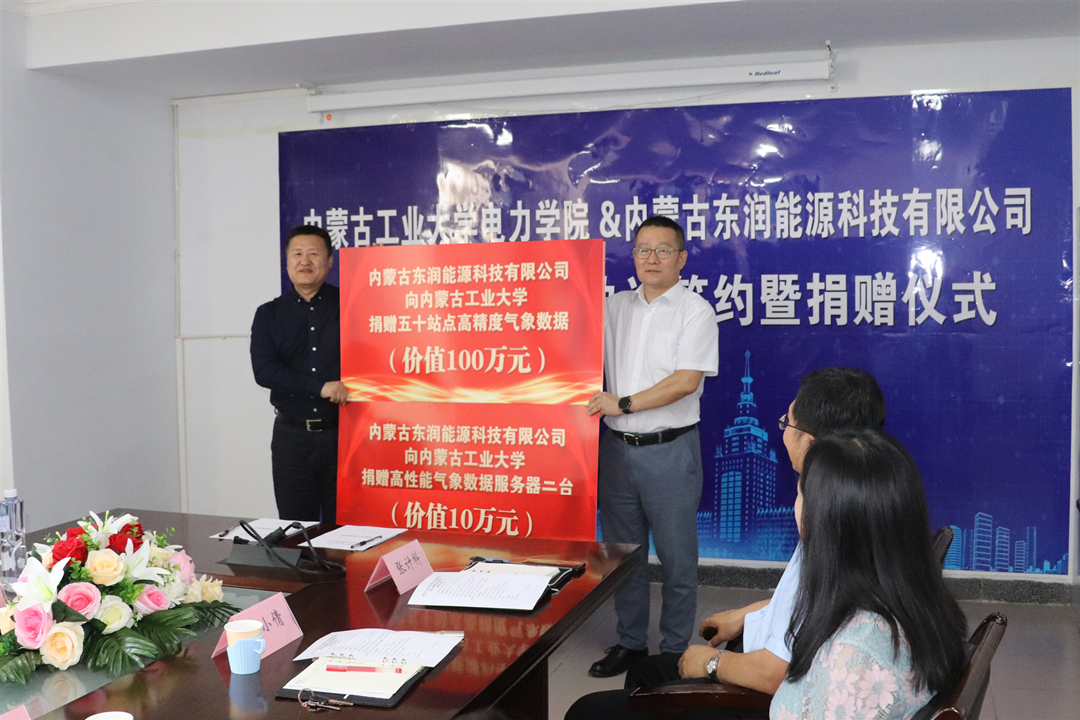 9月10日,在我校70周年校庆即将来临之际,内蒙古东润能源科技有限公司(简称东润能源)与电力学院签订战略合作框架协议并捐赠110万元设备与数据资料(包括2台高性能气象数据服务器(价值十万元)、气象预报空间分辨率3*3km的高精度多国气象数据(价值一百万元)。东润能源董事长刘全东、总经理张亮、总经理助理蒋慧玲、研发部部长雷震、财务总监赵娟、人力资源部部长魏丽,学院领导彭建兵、王志和、董小倩、刘广忱、张计科和相关人员出席仪式。