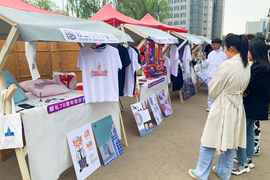 为迎接建校七十周年,拓宽实践育人路径,打造学生活动品牌,展示学院“三全育人”成果,5月13日至14日,轻工与纺织学院献礼七十周年校庆主题文创作品展在新城校区田径运动场南侧篮球场举行。校党委书记孙国权、副校长峻峰、纪委书记阿力坦嘎日迪和学校部分职能部门负责人莅临展览现场参观,对参展作品给予了高度评价,并对轻工与纺织学院专业建设所取得的成果给予了肯定。