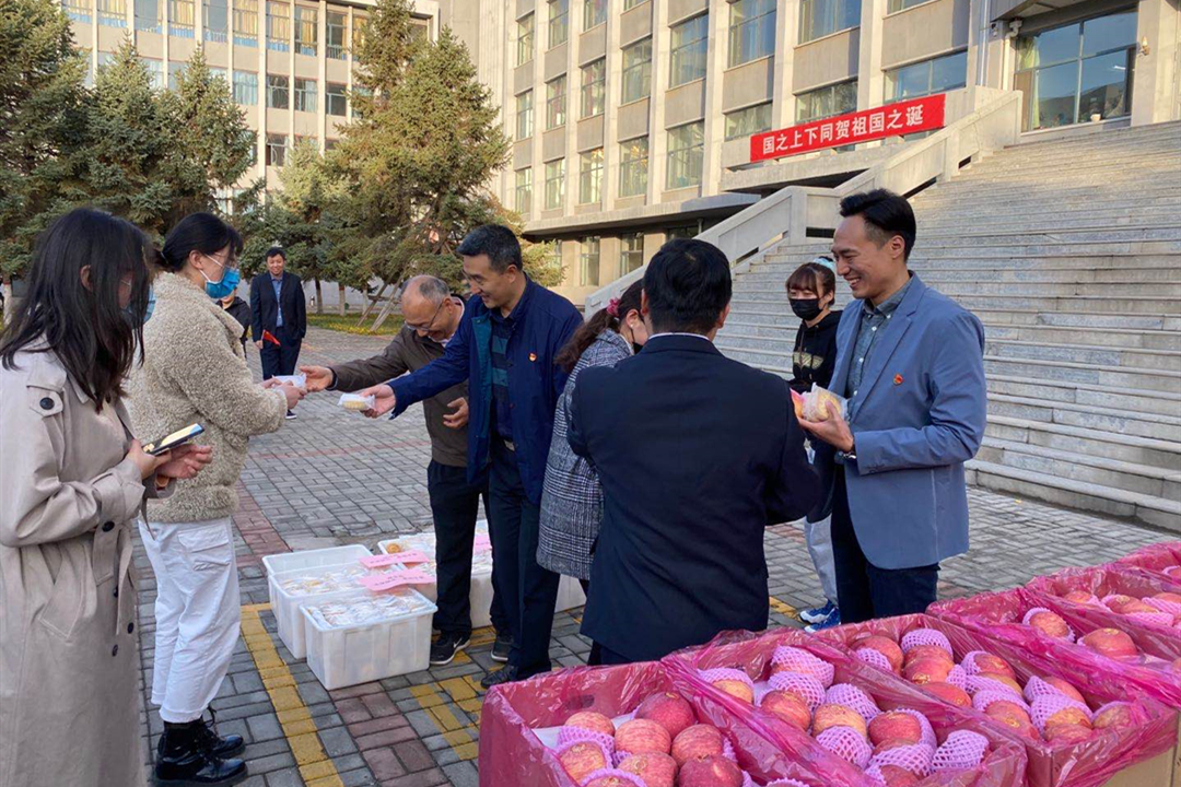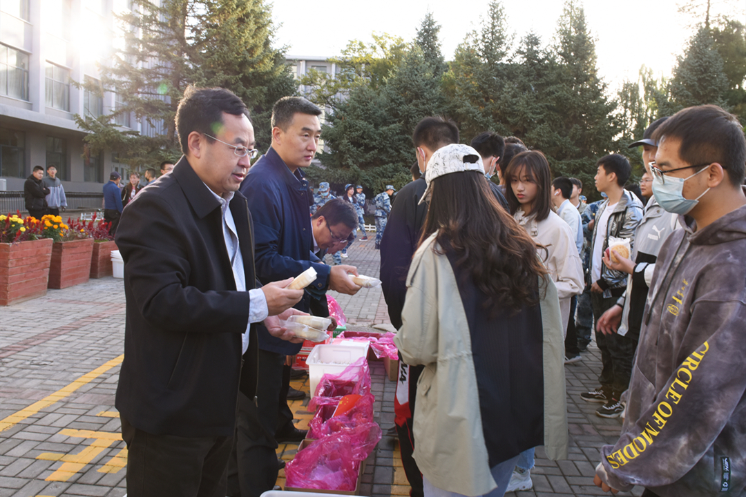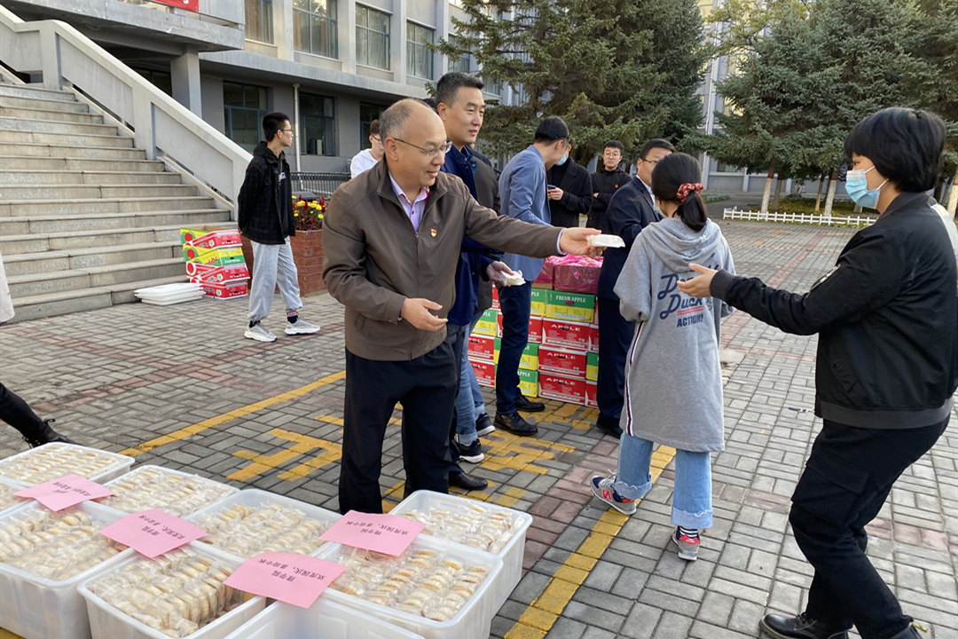 月到中秋分外明,今年的中秋节国庆恰逢一天,既是举国欢庆也是阖家团圆的日子。10月1日早上,理学院全体院领导、各系部负责人、辅导员和新生班班主任一起,在理学院楼前广场为全院在校本科生硕士研究生、博士研究生共1000余人发放月饼和苹果,给同学们送上节日的祝福。