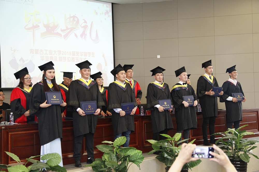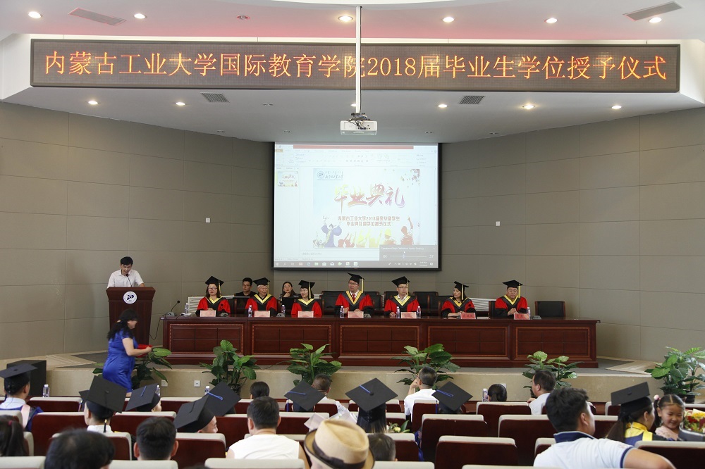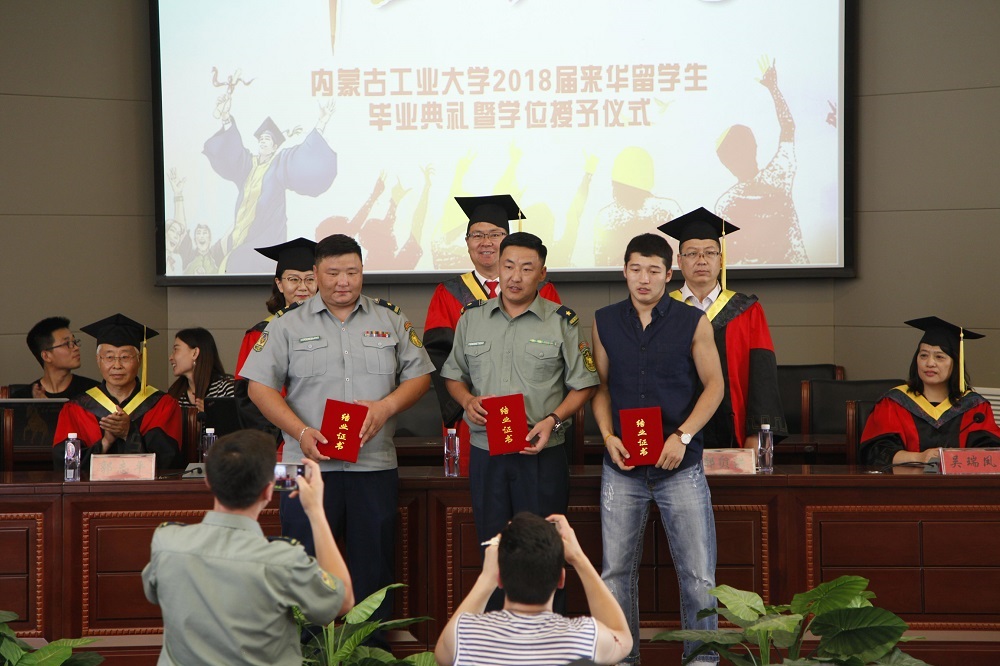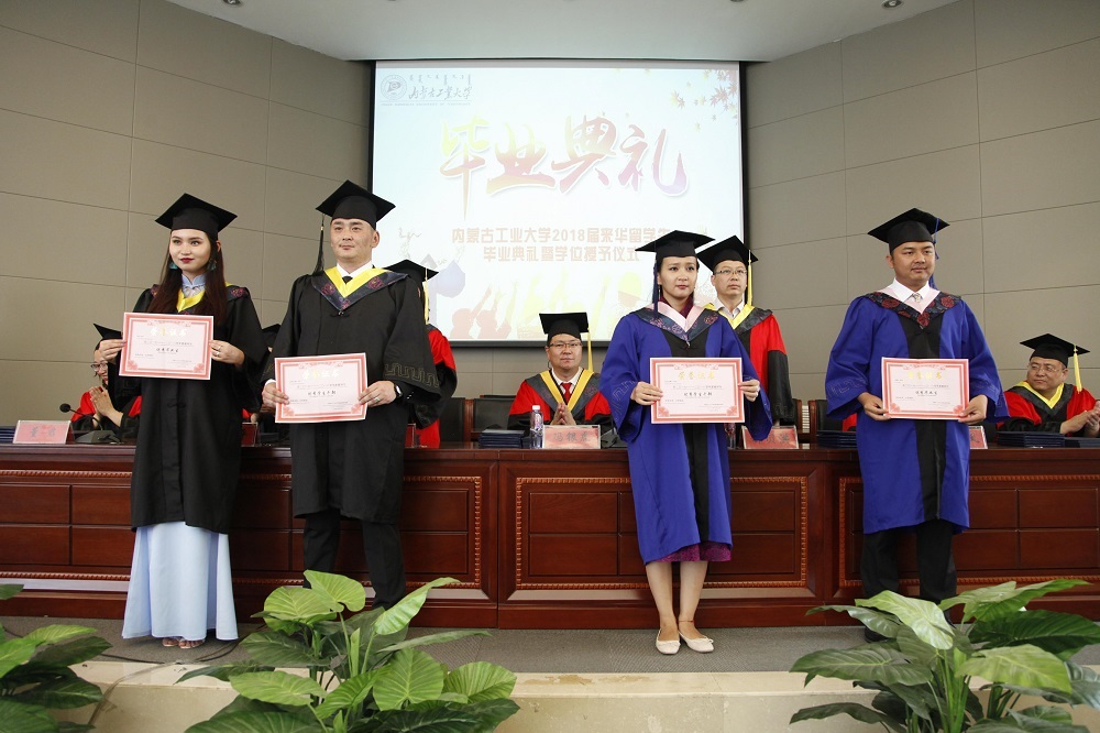 国际教育学院副院长董君宣读《关于表彰内蒙古工业大学国际教育学院2018届“优秀毕业生”及“优秀学生干部”的决定》以及内蒙古工业大学2018届国际教育学院毕业生、结业生名单。领导和导师们为获得“优秀毕业生”“优秀学生干部”的毕业生颁发证书,为全体毕业生拨穗正冠、颁发学位证书,为蒙古国边防军2名进修生和1名汉语进修生颁发结业证书。