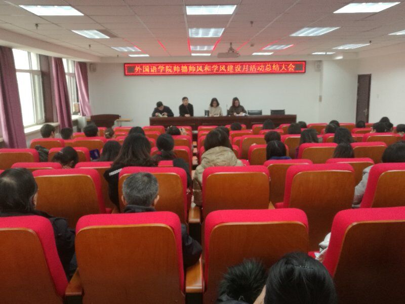 1214日下午,外国语学院在金川电力大楼400会议室召开第二届师德师风和学风建设活动月总结会。学院全体教师参加。学院党委书记霍天瑞主持会议。