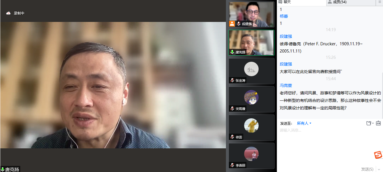 唐克扬教授与师生们分享了“活的中国园林——历史中的园林和设计师的梦境”研究的起因;通过对多个中外园林精彩案例的介绍与剖析,阐释了中国园林的现实与想象的关系,让同学们了解到景观园林中梦境与设计语境是相通的。