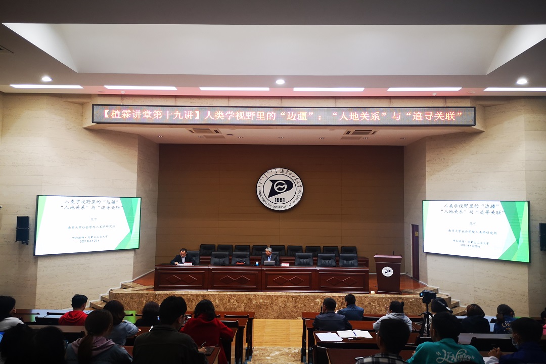在中国共产党建党100周年与学校建校70周年之际,为进一步提升马克思主义民族学理论学科建设水平,4月29日下午,在我校新城校区明德楼第二报告厅,科学技术处、校社科联、马克思主义学院和人文学院联合举办《植霖讲堂》第十九讲——人类学视野里的“边疆”:“人地关系”与“追寻关联”主题学术讲座。中国人类学学会副会长、南京大学社会学院范可教授主讲。科学技术处副处长布和朝鲁教授主持和点评。马克思主义学院和人文学院领导和师生到场聆听讲座。