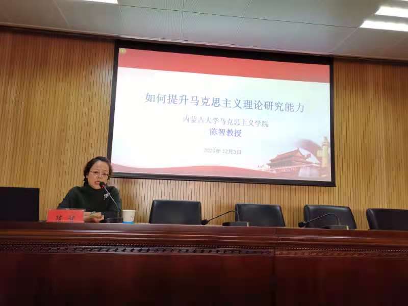为促进马克思主义学科建设,提升师生的马克思主义理论研究能力和研究水平,123下午,马克思主义学院、内蒙古区情研究中心在新城校区思创楼五层会议室举办“如何提升马克思主义理论研究能力”专题讲座。邀请内蒙古大学马克思主义学院党总支书记兼常务副院长陈智教授作讲座。