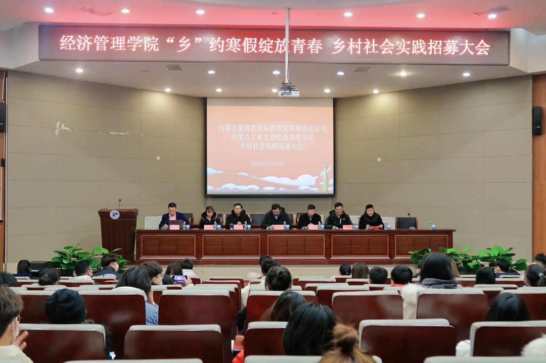 12月16日,经济管理学院在新城校区图书馆报告厅举办乡村社会实践招募大会。我校MBA企业导师、蒙清农业科技开发有限责任公司董事长刘俊辰,蒙清乡村创客中心负责人许占祥,蒙清董办专员贺文婕,经济管理学院党委书记任慧,党委副书记、副院长冀强,副院长乔洪滨,就业办公室负责人邹斌出席会议。120名本科生代表参加会议。会议由学院团委副书记贾国辉主持。