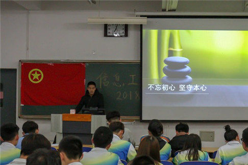 信息工程学院团委书记赵智琦领学了团的十八大的会议概况中央致辞解读了大会报告和新修改团章。希望同学们坚定理想信念、练就过硬本领、勇于创新创造、锤炼高尚品格,在弘扬和践行社会主义核心价值观中实现自己的个人价值。