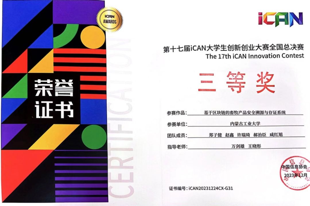 12月26日,第十七届iCAN大学生创新创业大赛全国总决赛在北京圆满结束。经过激烈角逐,由我校数据科学与应用学院万剑雄教授、王晓彤老师指导,数据科学与应用学院学生郑子健许瑞琦、赵鑫、郝治臣、机械学院学生咸红旭组成的“牧业区块链溯源系统”项目团队获全国三等奖。