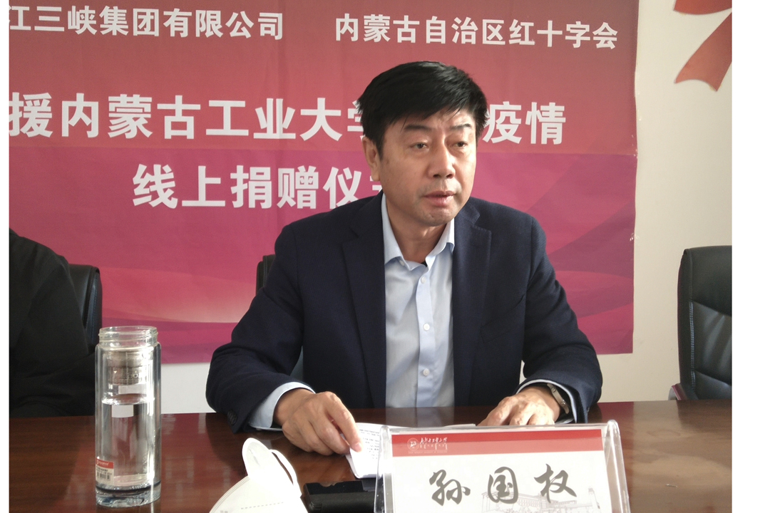 孙国权说,在学校疫情防控最关键、最紧要的时刻,三峡集团及时伸出援手,慷慨捐赠1000万元,必将有效缓解我校防疫资金紧缺燃眉之急,极大提振全体师生战胜疫情的信心和决心。自治区红十字会作为党和政府在人道领域联系群众的桥梁纽带,积极为我校筹募善款物资,自治区有关厅局、各兄弟高校、企业和部分校友以及其他各界爱心人士通过捐款捐物供餐等多种形式支援我校抗疫。我们将充分利用好捐赠款项和各类物资,发挥好捐赠资金和物资的使用效益,坚定不移做好校园疫情防控工作,全力守护师生生命安全和身体健康。我们坚信,在以习近平同志为核心的党中央坚强领导下,在自治区党委政府的重视关怀和自治区疫情防控指挥部统筹指挥下,在以三峡集团为代表的社会各界的关心帮助下,内蒙古工业大学一定能够打赢这场抗疫之战。待疫情散去,期待与三峡集团在人才培养、科技攻关、技术服务和成果转化等方面开展更为深入的交流合作,在深化友谊的同时,充分发挥自身人才与技术优势,全力助推三峡集团的高质量发展。
