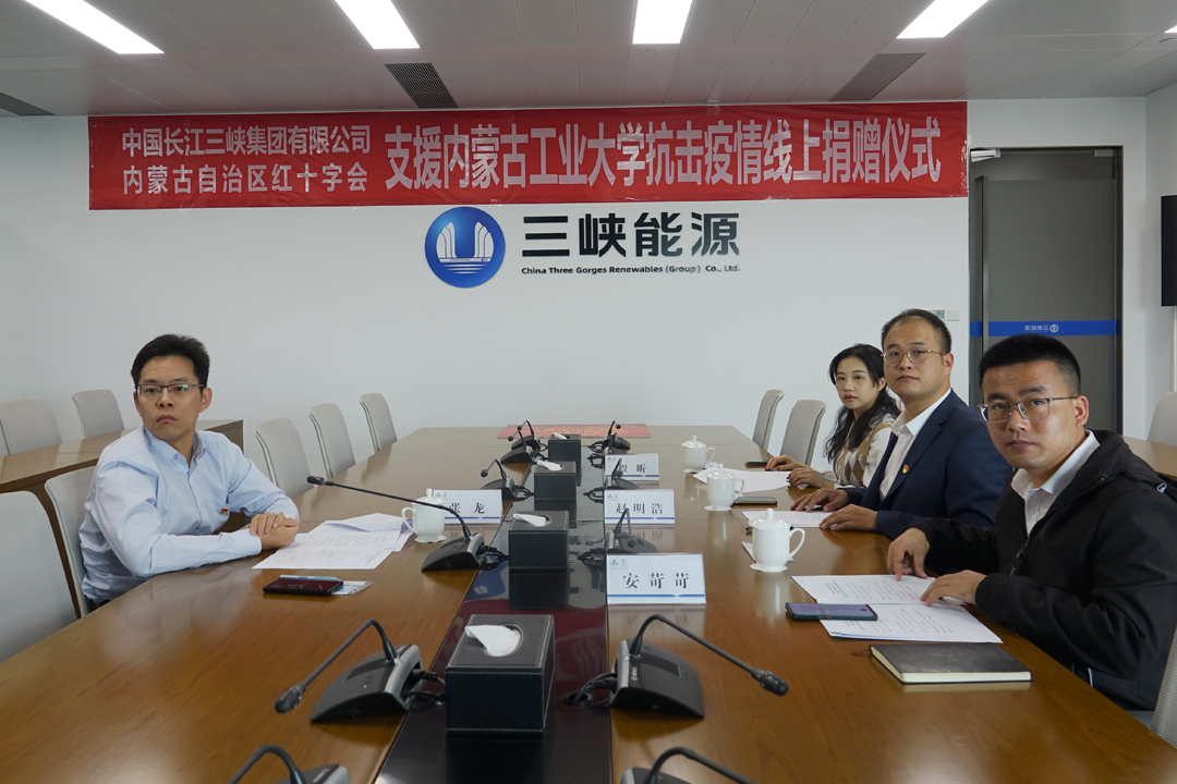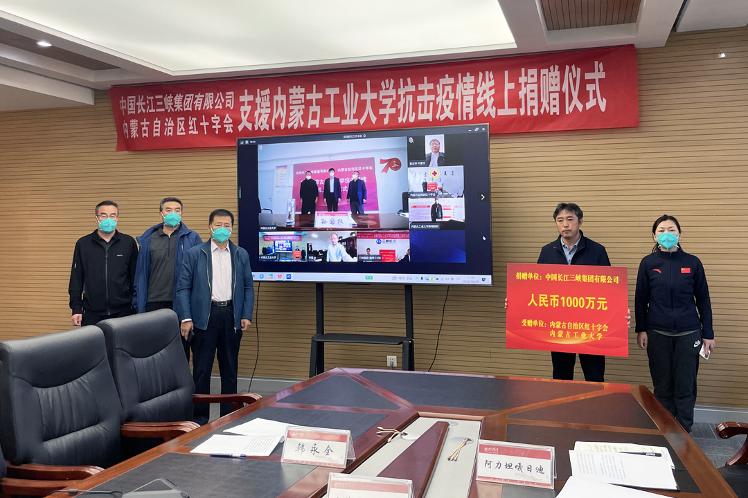 中国长江三峡集团有限公司通过内蒙古自治区红十字会向我校捐赠1000万元人民币,助力我校抗击疫情。10月14日上午,中国长江三峡集团有限公司、内蒙古自治区红十字会和我校共同举办云端捐赠仪式。中国长江三峡集团有限公司社会责任办公室主任李磊致辞,中国三峡新能源(集团)股份有限公司总经理、党委副书记张龙致辞并递交捐赠牌,自治区红十字会党组书记、常务副会长杨凤屹致辞并转交捐赠牌。我校党委书记孙国权致辞,校党委委员、副校长韩永全主持捐赠仪式并代表学校接受捐赠牌。