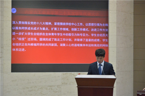伊日桂同学代表自治区学联致贺词。第二十四届学生会主席牛晓波同学向大会作了题为《勤奋学习,为发挥学生会组织重要作用勇于实践,为实现中华民族伟大复兴中国梦奋发成才》的工作报告。报告总结了五年来我校学生会的工作,回顾了本届学生会在服务青年学生、加强自身建设、打造校园文化品牌、创新社团发展模式、探究权益发展等方面所作的努力,展望了今后一个时期学生会的主要工作任务。