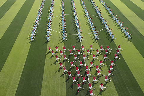 能源与动力工程学院244名同学带来的“律动青春”团体操表演,让体育场霎时沸腾起来。意气风发的学子,迎着朝阳舞动着青春的旋律,在蓝天绿地之间,释放青春的色彩。他们手中挥舞的,仿佛不是红黄两色的流苏花束,而是灿烂的青春和似火的激情。