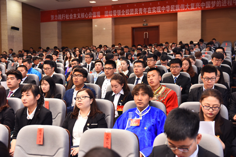 金瑞讲话。他指出,长期以来,我校共青团在自治区团委和学校党委的正确领导下,紧扣时代主题,围绕学校改革发展大局,着眼学生全面发展需求,团结带领全校广大团员青年,在思想教育、校园文化、创新创业、社会实践、志愿服务和自身建设等方面取得了可喜的成绩,在服务学校中心工作、促进学生成长成才,维护校园和谐稳定等方面做出了重要贡献。金瑞提出四点希望:一是希望全校团员青年志存高远,努力成为理想远大、信念坚定的时代青年;二是希望全校团员青年发奋学习,努力成为实践创新、有所作为的时代青年;三是希望全校团员青年锤炼品格,努力成为品德高尚、引领新风的时代青年;四是希望全校团组织坚持党建带团建,全面加强自身建设。金瑞最后希望全校广大团员青年、广大团干部、各级团组织以本次大会的召开为契机,继承和发扬我校共青团工作的优良传统,开拓创新、锐意进取,以青春梦想、用实际行动为实现“中国梦”贡献自己的青春和力量,在全面建成小康社会的宏伟进程中建功成才。