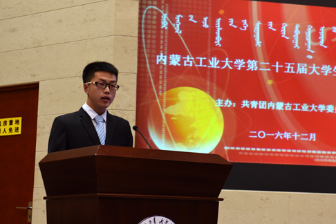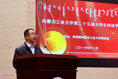 会上,播放了我校第二十五届大学生科技学术节宣传片,王武介绍了在本次科技学术节期间院校两级科技活动的具体活动安排。栗文义宣读了《关于表彰内蒙古工业大学第四届“校园科技明星”、大学生科技创新活动“优秀指导教师”“优秀项目团队”“优秀组织单位”的决定》,对获奖的优秀集体、学生和教师进行了表彰。2016年全国青年科普创新实验暨作品大赛获奖作品“逆风负重行走风车”进行了精彩演示。学生科技创新活动优秀指导教师代表、理学院杜云刚,校园科技明星代表、能动学院贺明飞同学分别发言。
