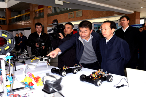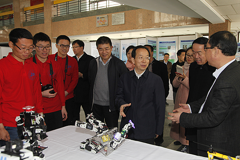 在第三教学楼一层大厅,工程训练中心机器人创新团队的同学们展示了他们自己设计、编程、制作的各类机器人,汇报了它们各自的特点和应用领域。曾一春一行饶有兴致地观看了学生演示的爬坡机器人、全向轮机器人、水下机器人、3D打印机、无人机、仿生机器人、逆风负重机器人表演,并与同学们亲切交流相关设计、技术问题。