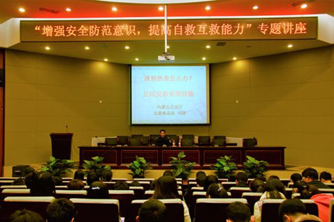 田雨丰警官结合展板内容,围绕如何辨别可疑人员、可疑车辆,在车站、机场、公交车、商场等公共场遇到恐怖袭击如何应急处理,遇到突发事件如何自我保护、拨打报警电话注意事项等问题进行了详细讲解。志愿者向现场和来往师生发放了安全知识宣传手册、宣传折页200余册。刘冰警官作题为“增强安全防范意识、提高自救互救能力”专题讲座,并以视频宣传短片的形式结合国内外突发性暴恐案例和大学生受害案件中暴露出的问题,就如何提高自救互救的能力进行了讲解。