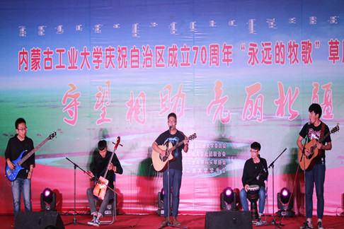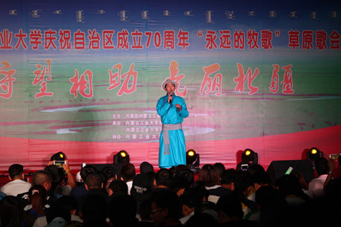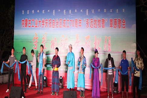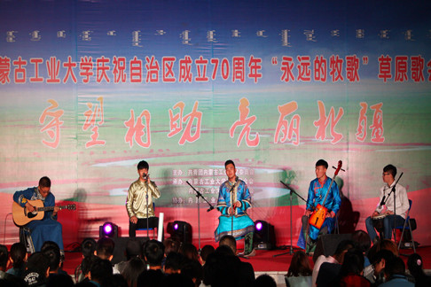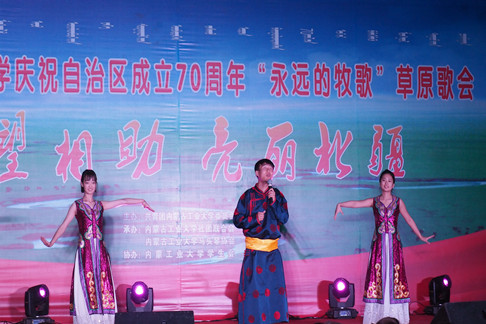 一首首悠扬的蒙古长调,打破了夏日校园的宁静,一阵阵婉转的马头琴旋律,扣动了无数青年学子的心。为庆祝自治区成立70周年,大力开展健康向上、格调高雅的校园文化活动,营造良好育人环境,524日晚,由校团委举办的庆祝自治区成立70周年“永远的牧歌”草原歌会在新城校区阳光广场举行,1000余名师生观看演出。