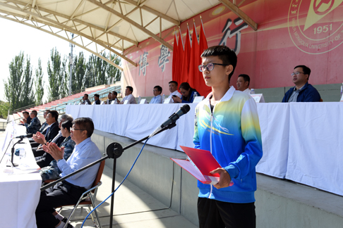 自治区教学名师陈亚杰教授代表教师发言,她向经历高考洗礼的新同学们表示祝贺,希望同学们学会独立思考,学会独立面对一切,在即将开始的大学生活中,找到自我,实现自我,超越自我。在校生代表裴珂在发言中深情回顾了自己入学时的情景,热情洋溢地向学弟学妹们介绍了学校为大家提供的广阔平台,号召新同学牢记师长和父母的殷切希望,不忘初心、砥砺前行。张璐代表新生发言时表示,面对全新的环境,要勇敢地创新,带着一颗蓬勃的好奇心,去探索科学的真谛、人生的乐趣,去寻找前进的动力、生活的目标。