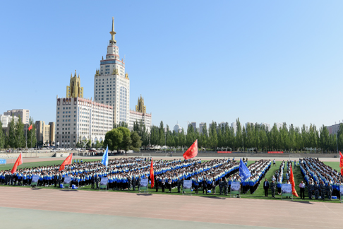 天高气肃,清风洒洒。9月6日上午,内蒙古工业大学2017级新生开学典礼暨军训动员大会分别在新城校区和金川校区体育场举行。中国人民解放军某部副政委武爱军,职教办主任刘成、副主任张红艳,我校领导金瑞、邢永明、刘志雄、刘进荣、黄龙海、栗文义、峻峰出席大会。校长邢永明讲话,副校长黄龙海主持大会,副校长峻峰宣布新生军训教官任命名单。相关职能处室负责人、各学院有关负责人及2017级全体新生参加大会。