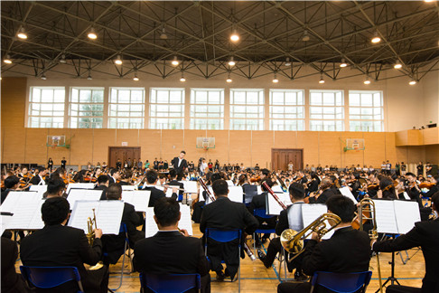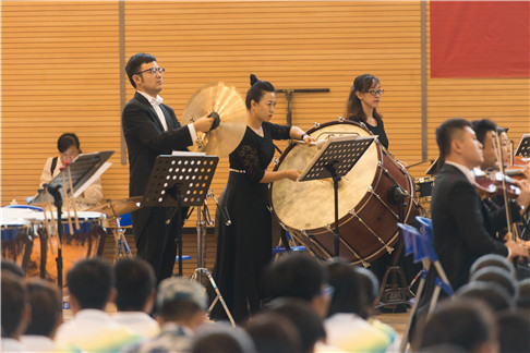 听众们环绕乐团席地而坐,这种几乎零距离的接触,让同学们直观感受到配合默契的乐团所呈现出的精彩演出,更感受到了一名指挥家对于完美演出的重要性。青年指挥家金刚在曲目间隙,用幽默风趣的语言为同学们简单介绍演奏曲目的名称、由来,也拉进了交响乐与同学们的距离。乐团演奏演奏一些曲目前,指挥并没有告诉同学们曲目名称,可许多同学很快就说了出来。其实交响乐就在我们身边,只不过她融入到了更广泛的艺术表现形式中,我们有时没有注意到而已。十曲奏罢,身着正装的全体乐团成员起立致谢,意犹未尽的同学们回馈乐团以一浪高过一浪的、经久不息的掌声。
