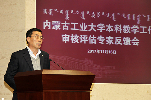 11月16日下午,内蒙古工业大学本科教学工作审核评估专家反馈会在教研楼第二报告厅举行。教育部审核评估专家组组长、河北工业大学原校长展永等专家组一行11人;自治区党委高校工委委员、自治区教育厅副厅长、党组成员(正厅级)、自治区社会科学联合会副主席(兼)张亚民;我校领导班子成员,各职能处室及教辅单位主要负责人,各教学单位书记、院长、副院长,各系部主任,各专业负责人,校本科教学督导组、本科教学工作委员会、学术委员会成员,近240余人参加会议。展永介绍专家组成员并主持会议,张亚民讲话,校党委书记金瑞作表态发言,校长邢永明介绍学校参会人员。