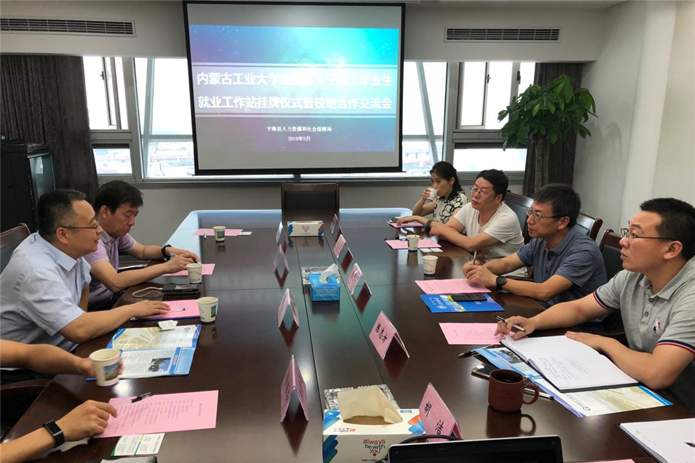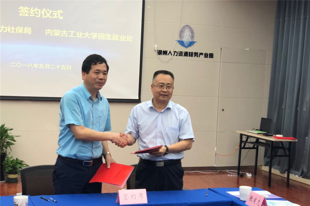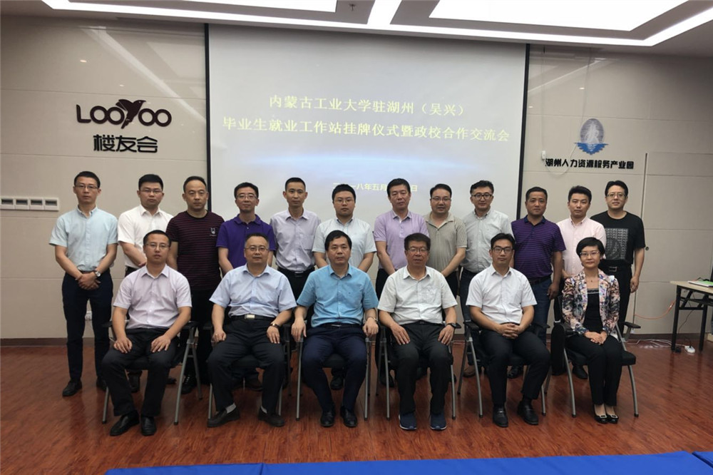 25日,黄龙海与招生就业处、机械学院、能源与动力工程学院、轻工与纺织学院相关人员一行7人赴浙江省湖州市吴兴区走访调研,在湖州市人力资源服务产业园举行内蒙古工业大学驻湖州(吴兴)毕业生就业工作站挂牌仪式暨政校合作交流会会上我校招生就业处处长郝镳与吴兴区委组织部副部长、区人力社保局党组书记局长郭士忠签订合作协议,黄龙海与湖州市就业局副局长郎昕为我校驻湖州(吴兴)毕业生就业工作站揭牌。